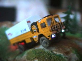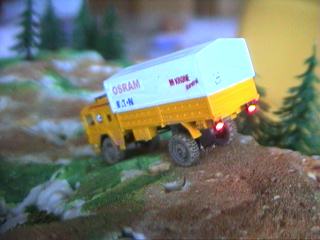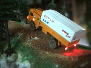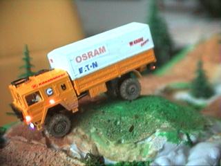 Der Einsatz von OSRAM SMARTLED's und einem selbst programmierten IC lässt sich die Beleuchtung sehr platzsparend und originalgetreu realisieren. An die LED's sind 0,12 mm Lackdrähte angelötet worden und dann außen auf das Gehäuse geklebt. Die LED kann so direkt als Scheinwerfer bzw. "Lampe" verwendet werden. Die Helligkeit und Farbquallität werten das Modell entsprechend auf.
