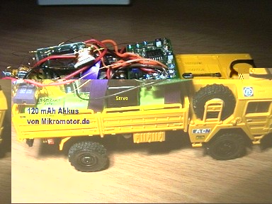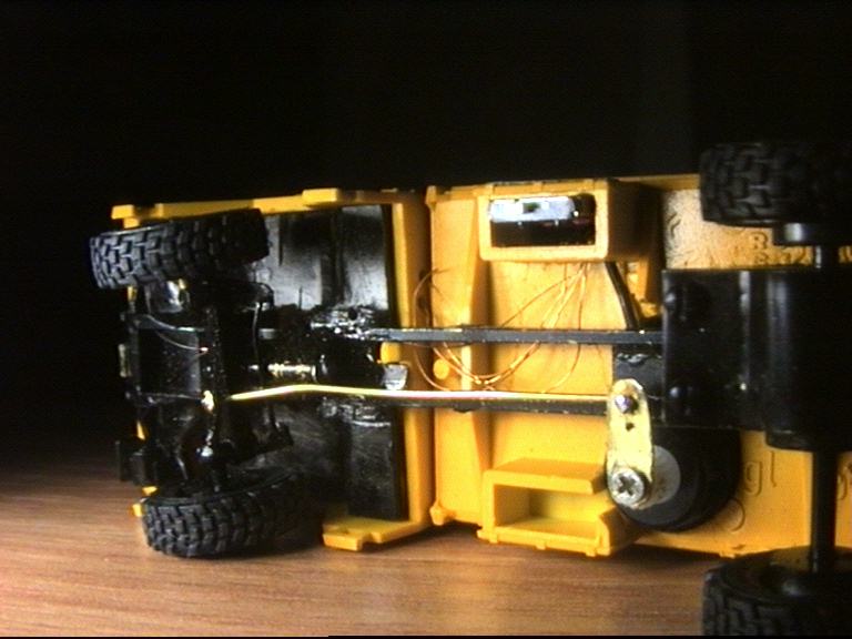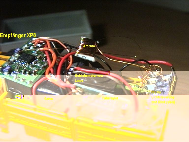 Der Einsatz von OSRAM SMARTLED's und einem selbst programmierten IC lässt sich die Beleuchtung sehr platzsparend und originalgetreu realisieren. An die LED's sind 0,12 mm Lackdrähte angelötet worden und dann außen auf das Gehäuse geklebt. Die LED kann so direkt als Scheinwerfer bzw. "Lampe" verwendet werden. Die Helligkeit und Farbquallität werten das Modell entsprechend auf.