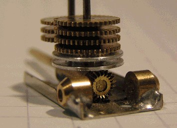 Zweiter filigraner Aufbau des Getriebes. Die Zahnräder sind wieder auf 0,5mm abgedreht. Gesamtuntersetzung 1:22542. Bei Vollgas bewegt sich der Arm meiner Meinung nach sehr schön im Verhältnis zum Original