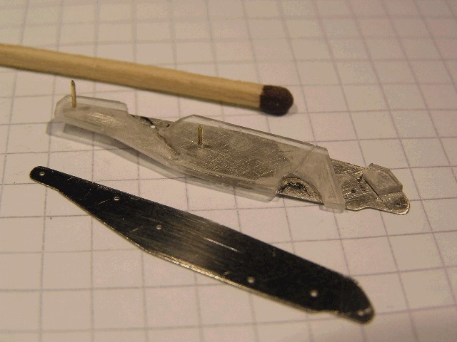 Unter dem vorderen Chassis ist eine Schnittstelle angeklebt. In die Löcher weden die Kabel, die nach innen führen, gelötet. Am Ende der Leiterbahn werden die Kabelschleifen angelötet, die um den Drehpunkt der Lenkung gelegt werden. Am Hinterteil dann die gleiche Schnittstelle. So lassen sich Kabelbrüche leicht reparieren. Rechts, siehts doch schon nach etwas aus..;o)