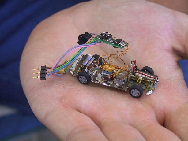 Den Bau eines PKW hatte ich schon aufgegeben, bis ich Markus Christl kennengelernt habe. Er hat eine IR-Fernsteuerung entwickelt und die ist so klein, dass sie in einem PKW Platz finden dürfte. Also entwickelte Markus die Software und bastelte die Platinen und ich kümmerte mich um die Mechanik für einen Omega.